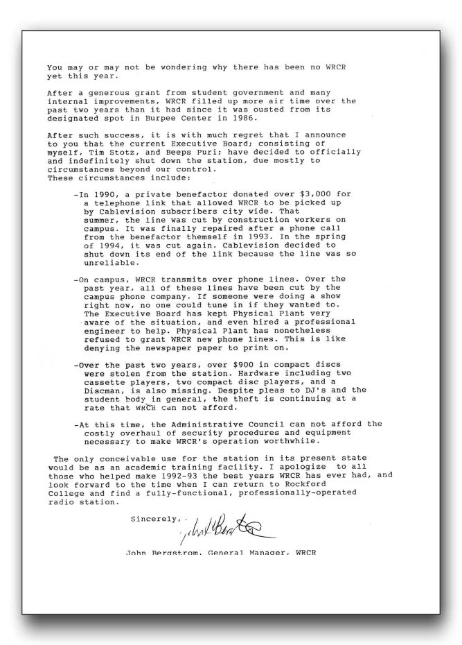 This letter to the campus community from WRCR General Manager John Bergstrom is believed to be from the Fall of 1994. It explains the reasons WRCR was not broadcasting.