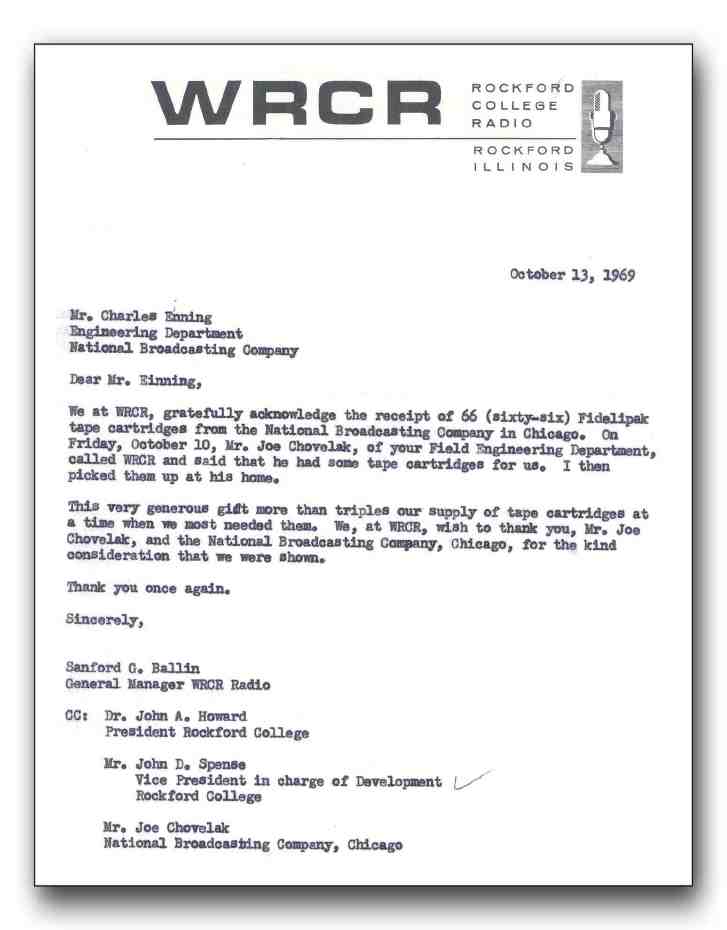 A letter from Sandy Ballin thanking NBC Chicago for a donation of tape cartridges. For some reason WMAQ (NBC's Chicago station) did not erase the carts prior to the donation thereby giving WRCR its first jingle package. Had we been on over the air broadcast station, we could not have legally aired the jingles.