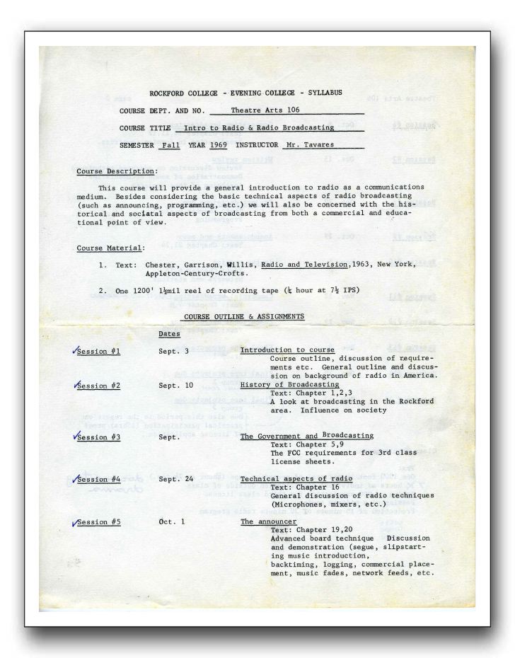 In the Fall of 1969, WRCR staff persuaded Rockford College to offer a broadcasting class. Through the efforts of John Spence, Frank Tavares a 6th grade teacher and part time announcer at WROK AM was hired to teach Intro to Radio & Radio Broadcasting in the night school. This is page 1 of the class syllabus.