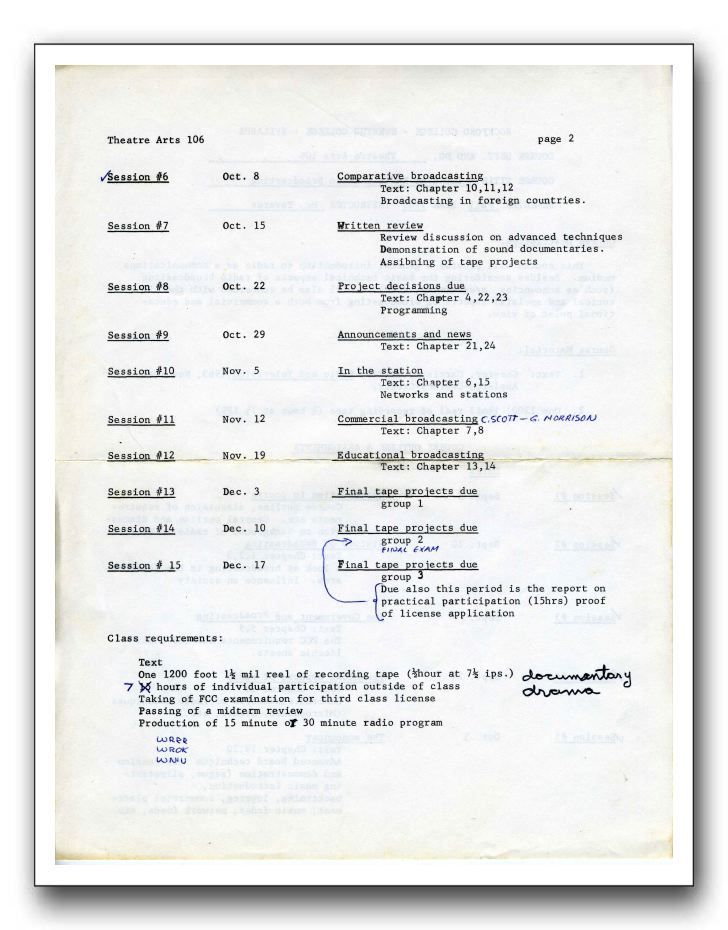 In the Fall of 1969, WRCR staff persuaded Rockford College to offer a broadcasting class. Through the efforts of John Spence, Frank Tavares a 6th grade teacher and part time announcer at WROK AM was hired to teach Intro to Radio & Radio Broadcasting in the night school. This is page 2 of the class syllabus.