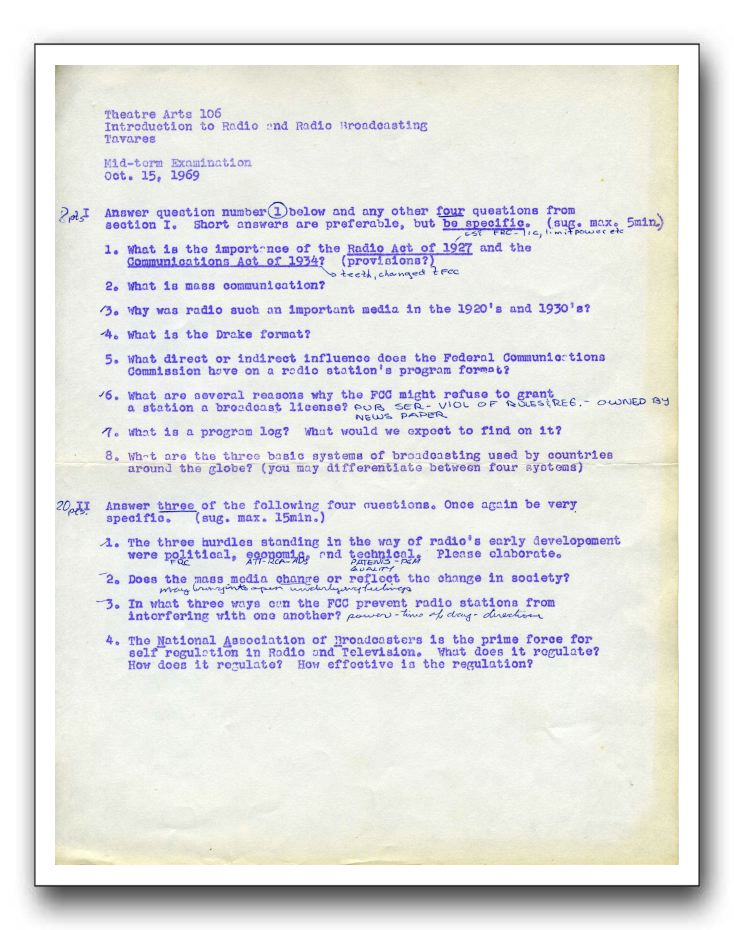This is the mid-term exam for the Fall 1969 Introduction to Radio & Radio Broadcasting taught in the Rockford College night school.contributed by Ross Hunter