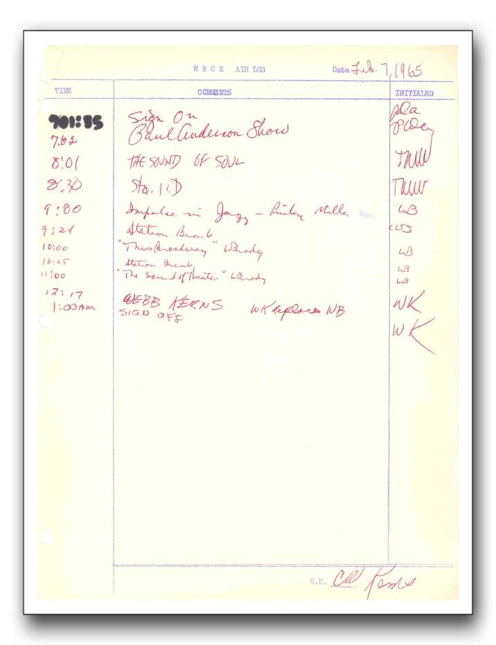 This is the earliest program log we've found. It dates from February 7, 1965.