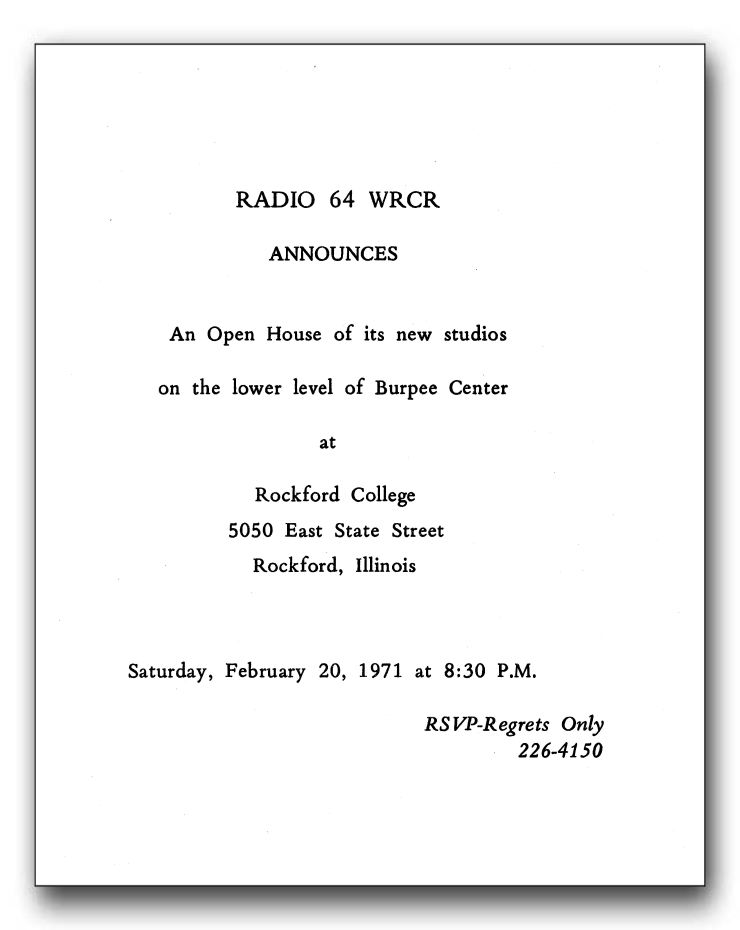This is the inside of the invitation to the February 1971 Open House showing off WRCR's new studios.
