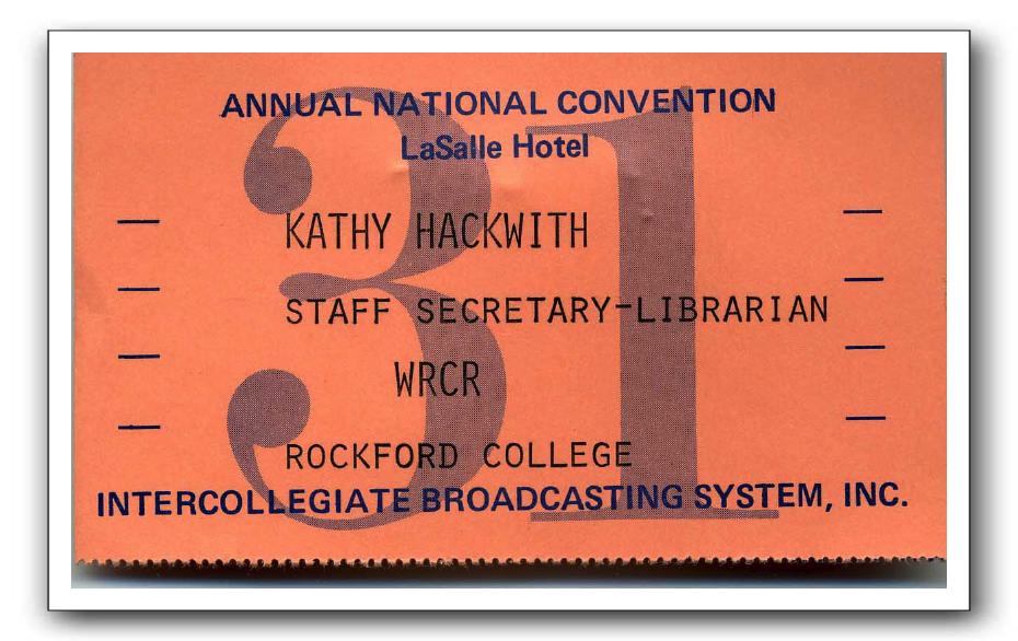 Eight WRCR staffers attended the 1970 31st Intercollegiate Broadcasting System Convention in Chicago. This is an ID badge from that event.contributed by Mark Groth