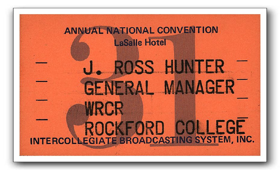 Eight WRCR staffers attended the 1970 31st Intercollegiate Broadcasting System Convention in Chicago. This is an ID badge from that event.contributed by Ross Hunter