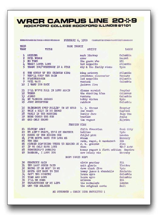 This was the WRCR music survey list for February 6, 1970. It just so happens we have the accompanying audio promo for the week of Feb 6, 1970. It is found in the audio section on the "miscellaneous" page. It's the first item on the page. How odd that these companion pieces both still exist and were saved over the years by different people.