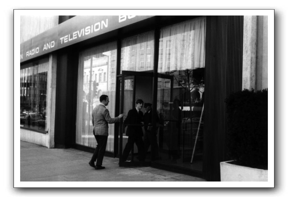(l-r) Ned Cohen and Ross Hunter enter the ABC broadcast center in Washington, DC on March 23 1969. They, along with Mark Groth, were in DC to attend the Intercollegiate Broadcast System convention and the National Association of Broadcasters equipment show.