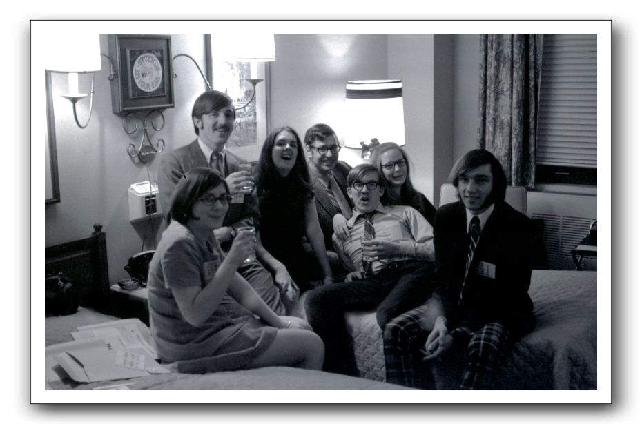 WRCR sent a large group to the 1970 Intercollegiate Broadcasting System convention in Chicago. Left to right: Cece Forrester, Ross Hunter, Ellen Mahoney, Brian Dubin, Dave Billingham, Kathy Hackwith, and Ken Flack.