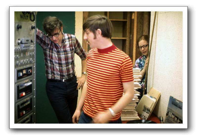 Brian Dubin, Ross Hunter and Kathy Hackwith ponder just how to dismantle and store WRCR's equipment for the summer of 1970. In the equipment rack are the three "new" cart machines donated to WRCR by WROK in April of 1970.