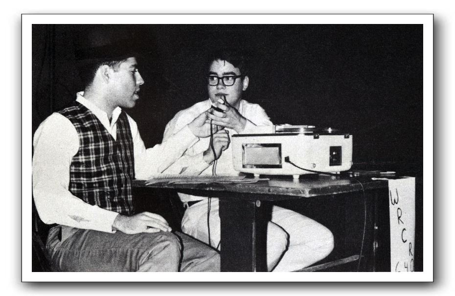 Charlie Miller (l) and Walt Wells (r) in a WRCR ad that ran in the May 13, 1967 issue of The Collegian. The are recording a game...probably basketball...for later broadcast on WRCR.Collegian photo courtesy of the Rockford University Archives