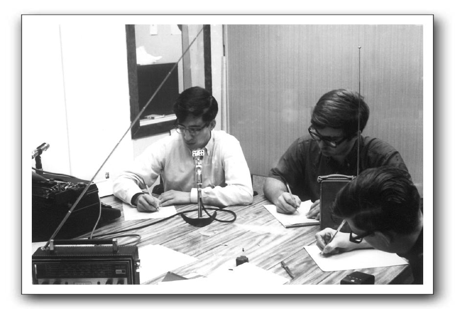 November 5, 1968 WRCR's Election Central covered the election returns. Richard Nixon defeated Hubert Humphrey. (l-r) Mike Porcaro, Mark Groth, Kerry Krentzke. Behind them is the backside of the record storage rack.Ross Hunter photo