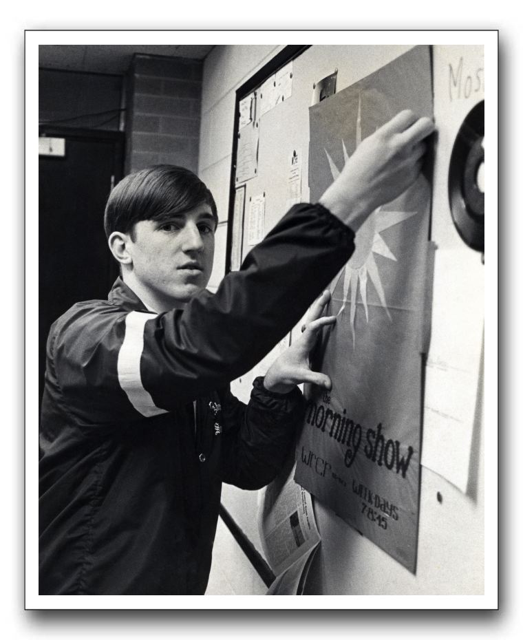Ross Hunter, Public Relations, with a poster for The Morning Show. Spring 1968yearbook photo by Wally Turnbull