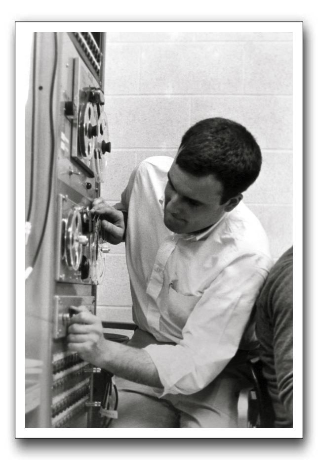 WRCR Station Manager Eric Hansen cues up a tape in the WRCR upper Burpee studios. Hansen was the Station Manager for the 1963-64 academic year and was one of the founders of WRCR.