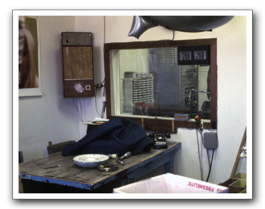 This picture was taken in April of 1970 from studio B looking toward the control room. Through the control room window you can see the one of three cart machines in the rack. In the upper right of the control room window is the phone light built by Brian Dubin. It silently alerted the announcer that the phone was ringing.