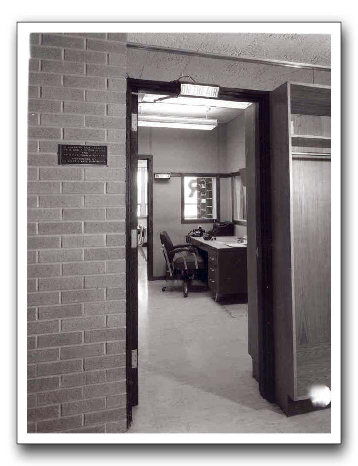 This undated picture is probably from 1964 or 1965 it shows the WRCR office from the Burpee hallway. WRCR moved to this space, that had previously been a typing room, in the Fall of 1964. Notice the "R" visible throught the window. It's on the exterior window of Burpee Center. Notice also that the "On The Air" signs are lit.