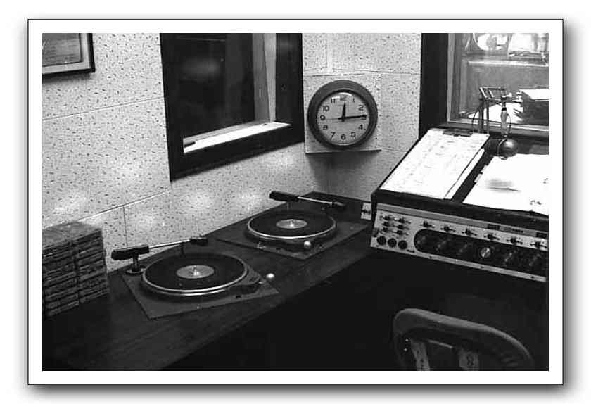 This picture is probably from the fall of 1968. The turmtables are newer than the ones pictured in the 1967-68 yearbook. Note the old looking microphone. Felt has not yet been added to the top of turntable cabinet. Someone's FCC license is just in the picture at the upper left. The stacked carts on the left indicate there is no cart rack yet.