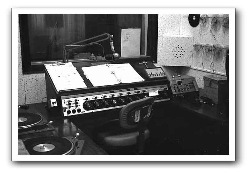 This picture was probably taken at the same time as the previous one, most likely in the fall of 1968. There is no felt on the turntable cabinet. The short reel-to-reel tapes on the right wall indicte this was before carts were widely used at WRCR. One of the reasons for their light use was an unreliable RCA cart machine. Note the old looking microphone. On the right just above the board is the remote control for the Magnecord tape deck which arrived in the fall of 1968.