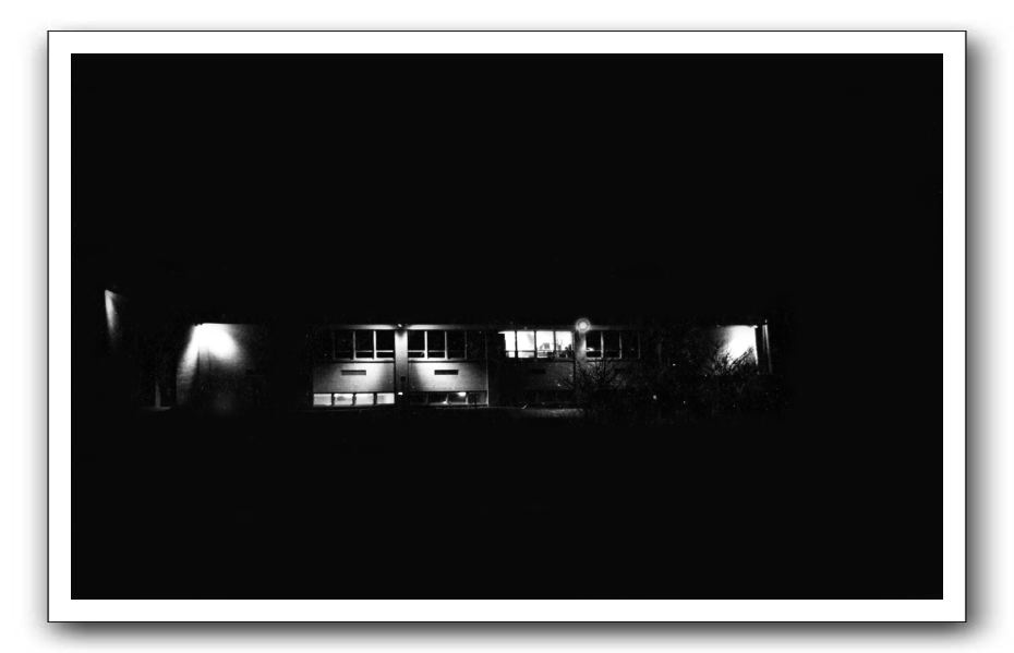 Burpee center at night. The lights are on in the WRCR studios. April 1970.