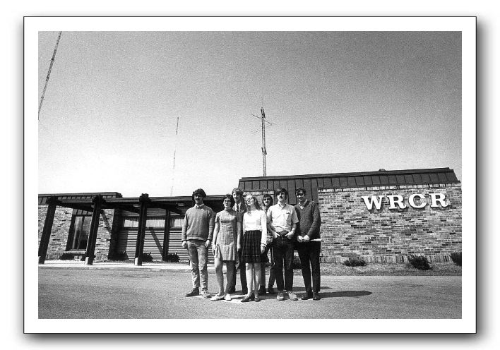 1969-70 staff pictured in front of WROK. A bit of pre-Photoshop editing was done to change the call letters to WRCR. Left to right: Mark Groth, Cece Forrester, Scott Monahan, Kathy Hackwith, Ken Flack, Ross Hunter, Brian Dubin.