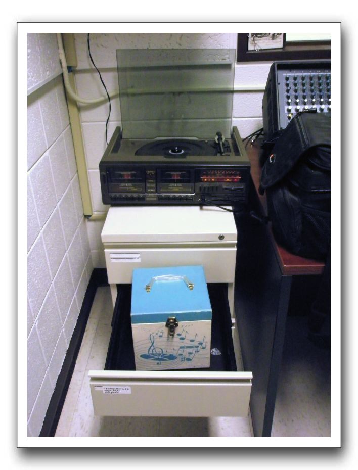 The Box of Vinyl takes up its post by the turntable in the Rockford College Radio control room. Cece Forrester photo