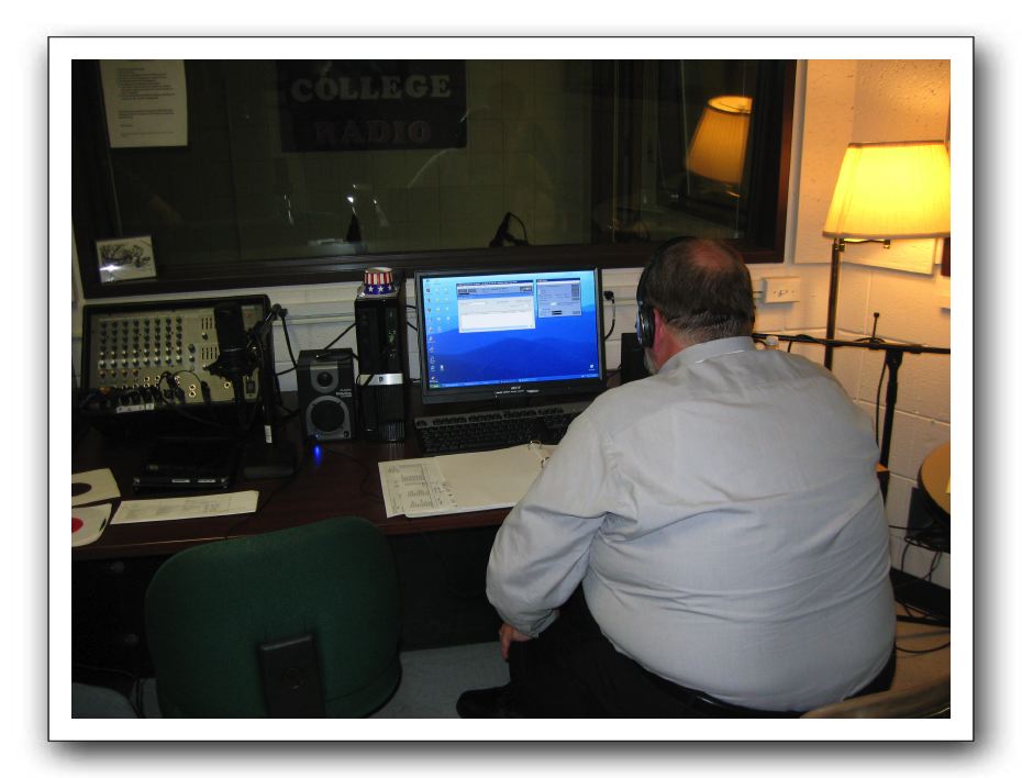 John Bace is on the air during the final hour of the Old School Radio Show on Saturday October 1, 2011 during reunion weekend at Rockford College. WRCR alums gathered to toast the new on-line radio station. Most of the new radio station is in the computer to the left of the monitor...quite a contrast to the old WRCR.