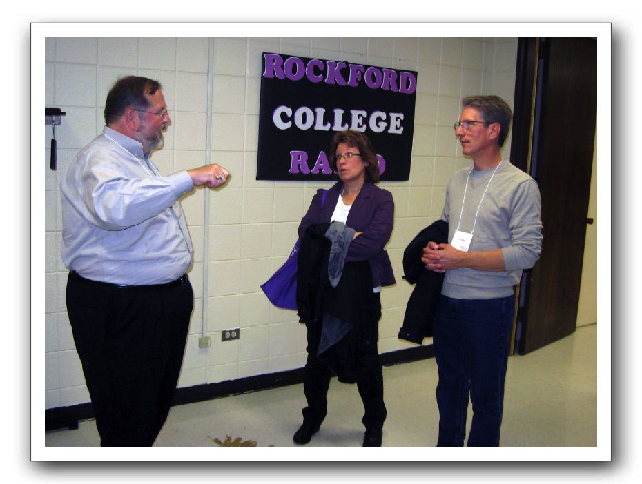 John Bace ’75 (l) talks with Robin Wingast LaBedz ’76 and Gary LaBedz during the 2011 WRCR Reunion. They’re in Studio B of the lower Burpee Center studios.Ross Hunter photo