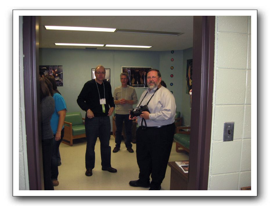 Former WRCR staffers in the lounge of Rockford College Radio. When WRCR occupied this space, this area was the engineering workshop, record library, and Traffic department. Current Rockford students Shayna Leber and Tracey Redeker are on the left. WRCR alums Brian Dubin, center, and John Bace, right, catch up on old times. Robin Wingast LaBedz is behind John. Her husband Gary is in the rear center.