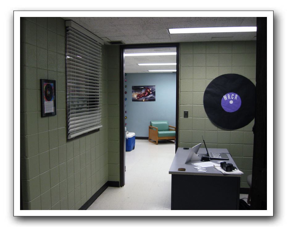 The office of Rockford College Radio. WRCR used this same space as an office when it occupied this space in lower Burpee Center. The control room is through the window on the left. Straight ahead is the lounge.