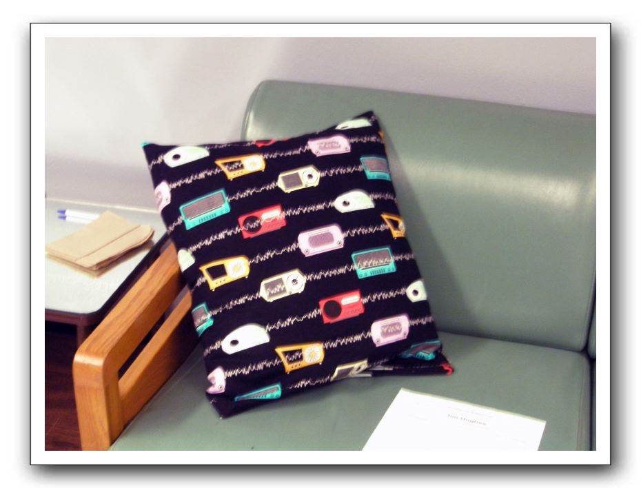 The lounge, or green room, features some throw pillows made by Cece Forrester with a vintage radio motif. In the early days of WRCR in lower Burpee Center, this space was the engineering workshop, record library and Traffic Department.
