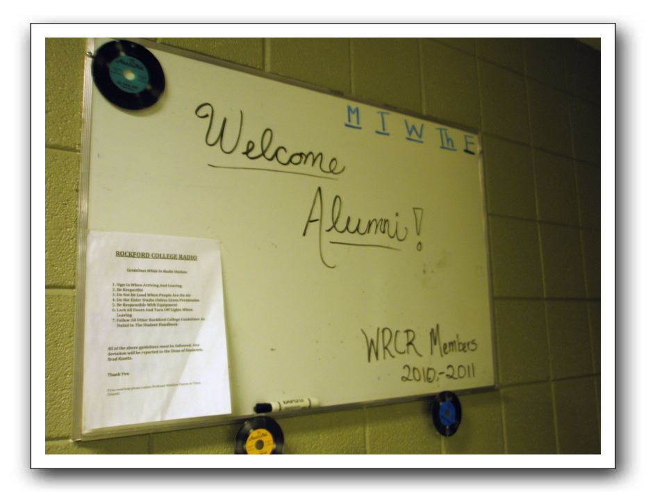 More greetings for returning WRCR Alumni on the whiteboard in the Rockford College Radio studios.Cece Forrester photo