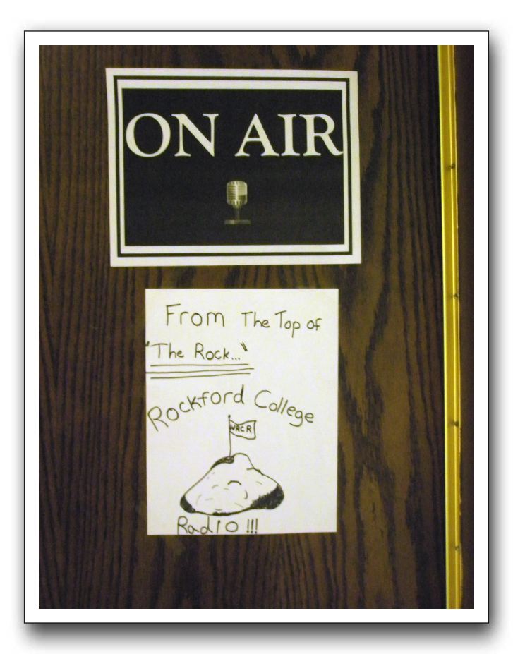 Signs on the control room door. Rockford College Radio's current slogan is "From the Top of the Rock".Cece Forrester photo