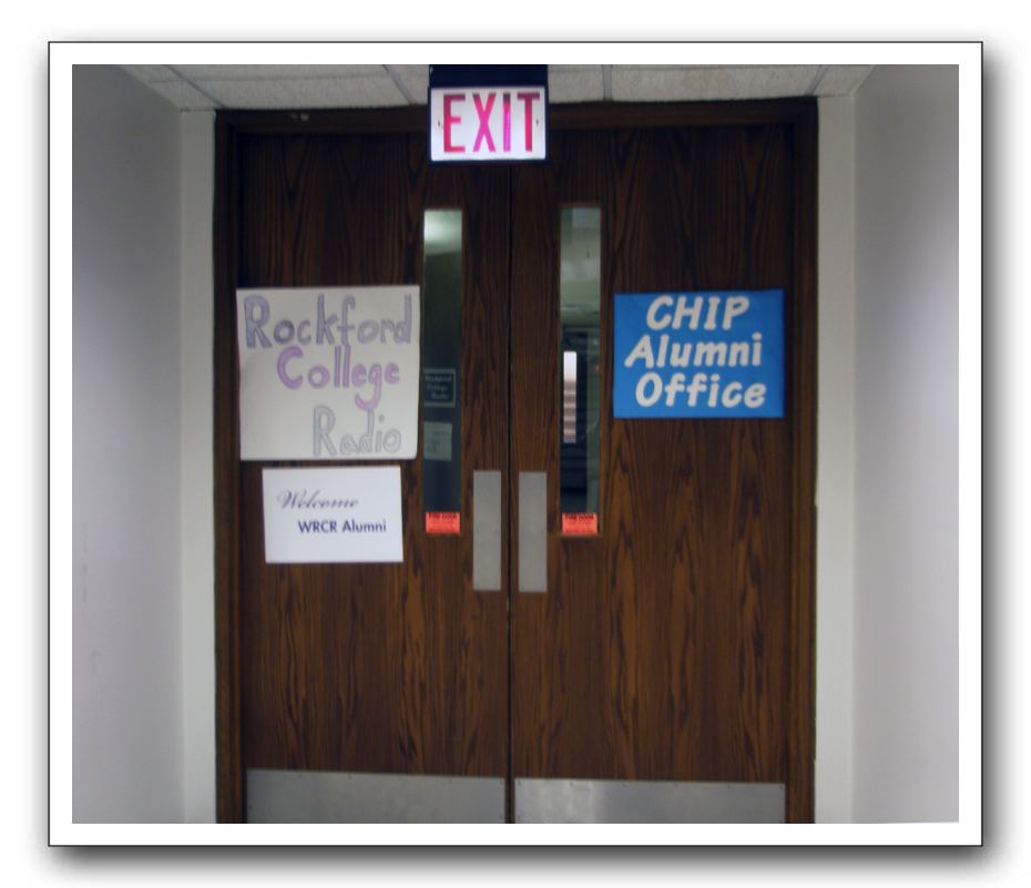 Signs on the double doors in Lower Burpee left no doubt that the station is straight ahead. In the early years of WRCR in lower Burpee Center, these doors did not exist.Cece Forrester photo