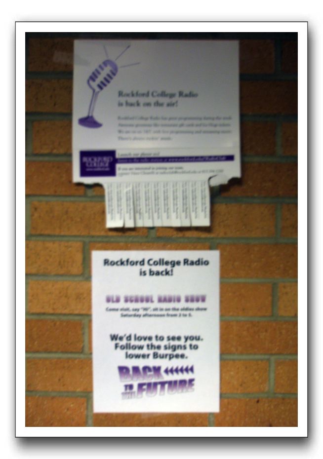Signage throughout Burpee promoted the station and the Old School Radio Show broadcast on Rockford College Radio on October 1, 2011 during reunion weekend.Cece Forrester photo