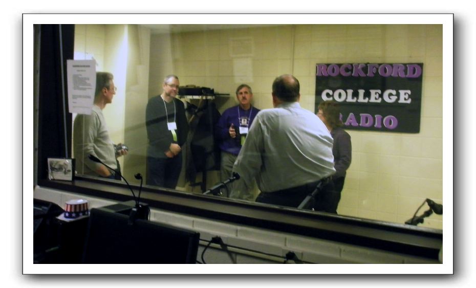 WRCR alums remember old times. This picture is looking from the control room into Studio B. (L-r) Gary LaBedz, Brian Dubin, Ross Hunter, John Bace, and Robin LaBedz. WRCR alums broadcast the Old School Radio Show on Saturday October 1, 2011 during Rockford Colleges's reunion weekdend.