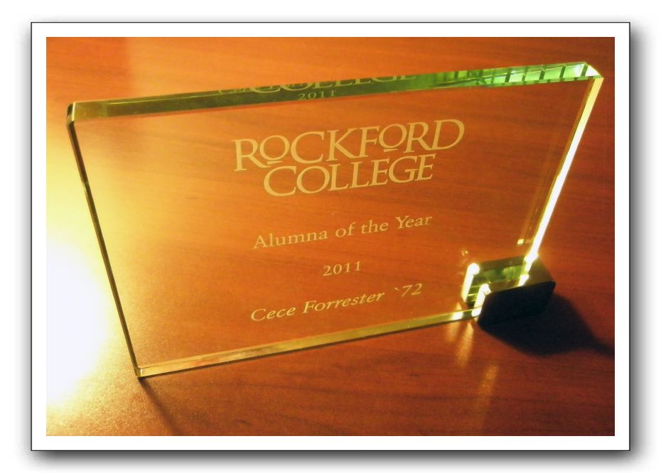This is the Alumna of the Year award presented to WRCR alum Cece Forrester on September 30, 2011 at the Alumni Awards program. Cece was chosen in part for her efforts to help Rockford College Radio get started Cece Forrester photo