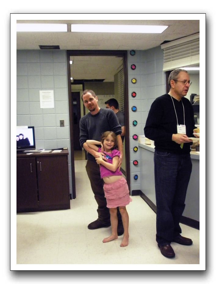 Rockford College Radio cofounder & former faculty adviser, musician and faculty member Matt Flamm and his daughter Ella visit with WRCR alums during reunion weekend. WRCR alum Brian Dubin is at the right. Rockford College Radio General Manager Vince Chiarelli is in the background.
