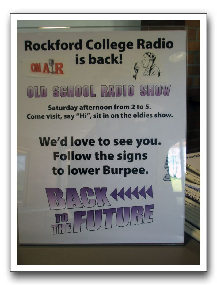 Signage throughout Burpee Center promoted the station and the Old School Radio Show which was broadcast on Rockford College Radio on Saturday afternoon October 1, 2011 during reunion weekend.