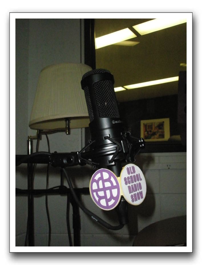 Cece Forrester added Old School Radio Show stickers to an old mic flag that John Bace found. This is one of the microphones in the Rockford College Radio control room in lower Burpee Center. This picture was taken during the 2011 reunion.