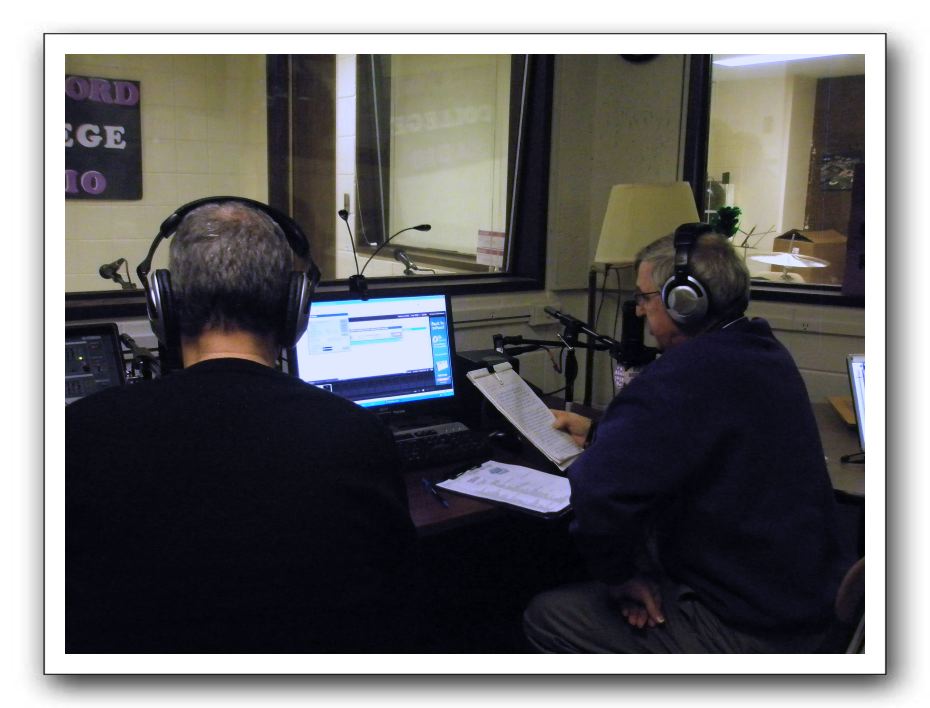 The Old School Radio Show broadcast is underway. Brian Dubin (l) and Ross Hunter (r) hosted the first two hours which included guest appearances by many WRCR alumni.