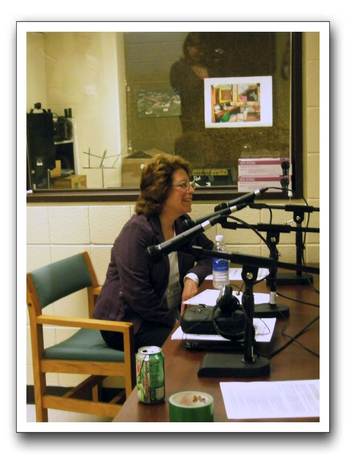 Robin Wingast LaBedz, WRCR alum, makes a guest appearance on the Old School Radio Show broadcast on Rockford College radio on October 1, 2011. She's in Studio B. Shayna Leber is reflected in the window above Robin. Shayna is on the Rockford College Radio staff.