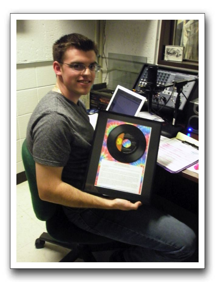Rockford College Radio General Manager in the radio station control room. He's holding the framed Aquarius presented during reunion weekend to the station staff by WRCR Alumni. The Fifth Dimension's Aquarius was the first record played by WRCR when the staff moved into the lower Burpee Center studio space in the fall of 1970.
