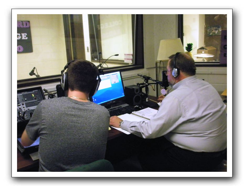 It's the final hour of the Old School Radio Show countdown of the top 50 vinyl 45rpm records chosen by WRCR alumni in on-line voting. Rockford College Radio General Manager Vince Chiarelli is on the left and WRCR alum John Bace is on the right. They're in the old WRCR control room in the lower Burpee Center studios.