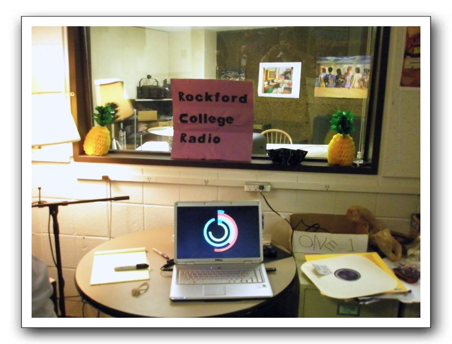 This picture is looking from the control room toward Studio A. The round table below the window, where the Old School Radio Show producer set up her laptop for the afternoon, marks the spot where the main console used to be when WRCR was in this space. It's also the same spot where WRCR alumni posed for a group photo six years ago as we toured the space, then in use for offices.
