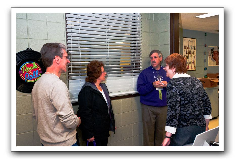 (l-r) Gary LaBedz, Robin Wingast LaBedz, Ross Hunter and Cece Forrester visit in the office of Rockford College Radio on October 1, 2011. The new radio station is in the space in lower Burpee Center that WRCR occupied from the fall of 1970 through the end of 1984.