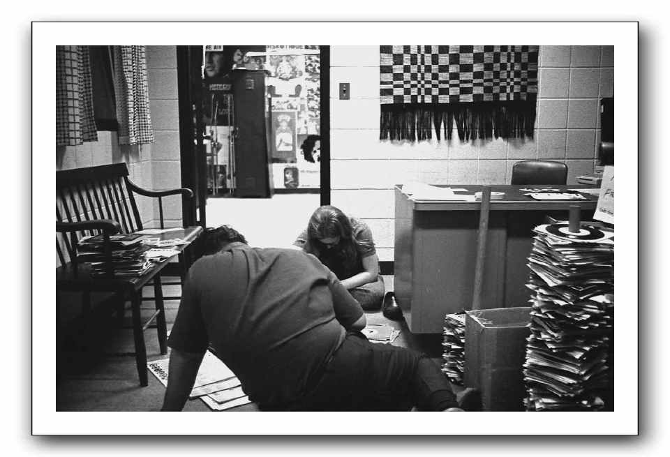 Gordon Klein and Kathy Hackwith reviewing surplus records in the WRCR office.