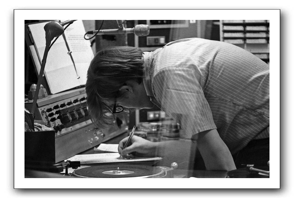 Dave Billingham filling out the program log during his show in the lower Burpee studios. 1971 photo by Ross Hunter