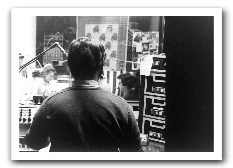 Mark Groth (back to camera) is the engineer for an interview taking place in studio A.Ross Hunter photo, 1971