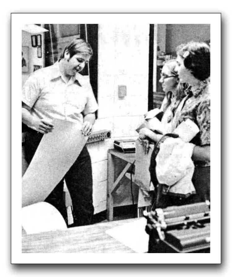 John Bace (left) from a September 14, 1972 Collegian article expains the newly installed teletype to unknown and Claire Paul.Collegian photo