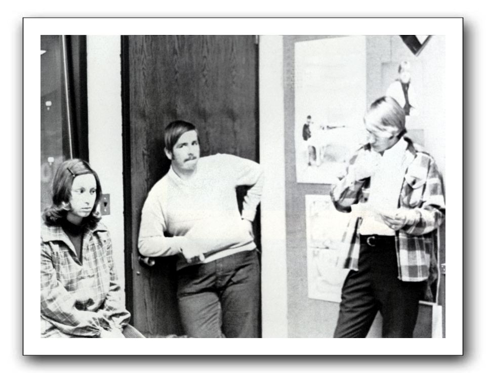 Karen Kaminski (left) and John Bace (center) with station advisor Dr. George Thompson.1973 yearbook photo scan by Stina Tanaglia