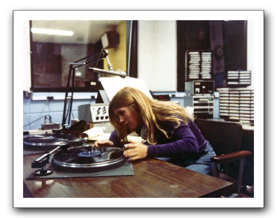 Becky Buford photographed in 1978 in the lower Burpee Center studios. The WROK donated Criterion cart machines have been replaced by the time this photo was taken. The ten-year-old Gates Yard was still in use.photo scan by Stina Tanaglia